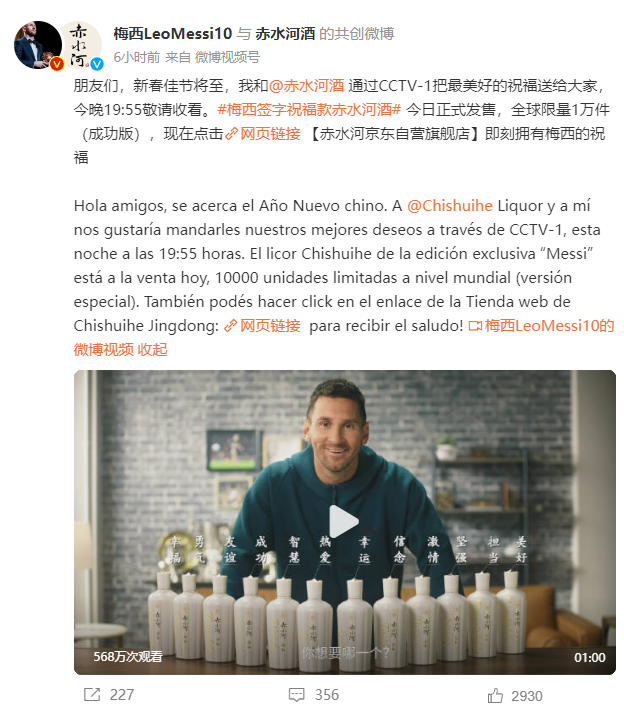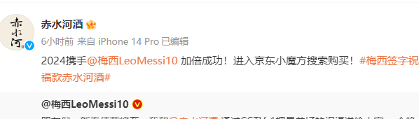 2023年8月1日,梅西在官方平台宣布一则代言公告,称已与白酒品牌“赤水河”达成品牌合作,成为其官方代言人。消息一出,引来多方猜测。当时,潮新闻记者曾向品牌关联公司贵州中赤酒业股份有限公司求证,对方表示,代言属实,但具体细节尚不便披露。