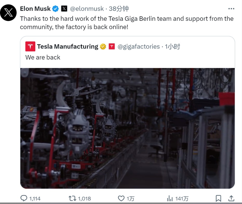 据每日经济新闻,马斯克3月13日在社交媒体称,特斯拉位于柏林的超级工厂已经恢复运营,并感谢员工们的支持。