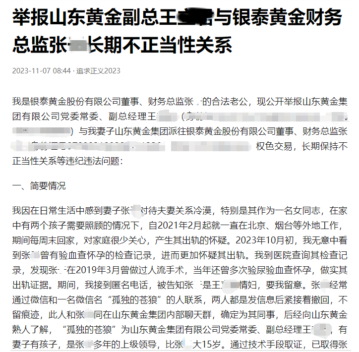 大皖新闻记者注意到,该网友在举报内容中首先介绍了其发现妻子出轨的全过程,“2023年10月初,我无意中看到张某(其妻子)曾有验血查怀孕的检查记录,进而更加怀疑其出轨。我到医院查询其检查记录,发现张某在2019年3月曾做过人流手术,当年还曾多次验尿验血查怀孕,做实其出轨证据。”该网友在发现妻子出轨后查询妻子微信聊天记录,发现妻子张某经常通过微信和一微信名为“孤独的苍狼”的人联系,而且该微信用户“孤独的苍狼”和张某同在山东黄金集团内部聊天群,后经向山东黄金集团内部熟人了解,“孤独的苍狼”为山东黄金集团有限公司党委常委、副总经理王某,“有妻子有孩子,是张某多年的上级领导,比张某大15岁。”